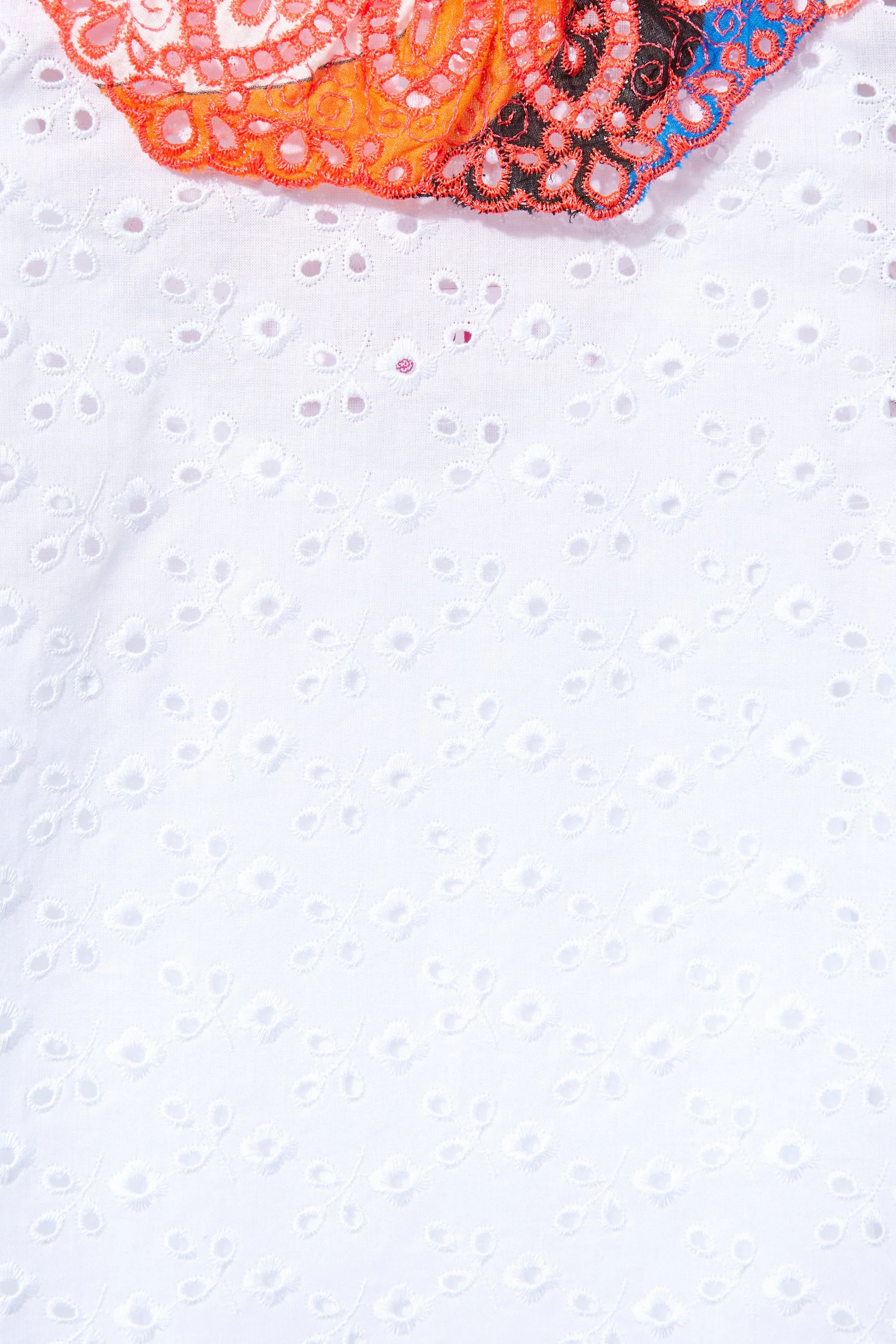Tonalità vibranti e ricercatezza di particolari: così la maison Pucci infonde il suo spirito giocoso nelle linee essenziali di questo abito svasato. La candida silhouette è costellata di dettagli in sangallo e incorniciata da ruches rosse a contrasto.