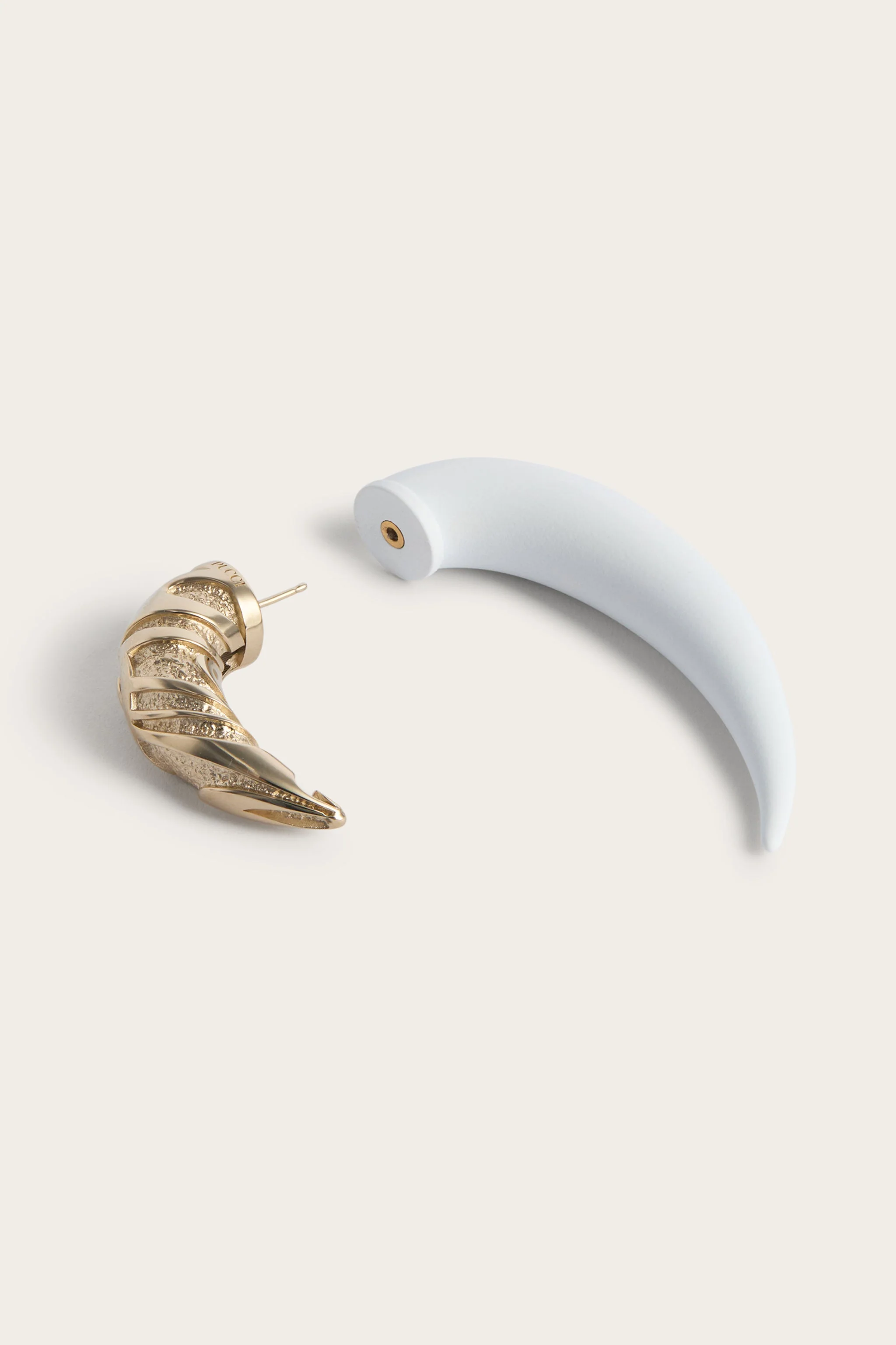 Un gioiello dal carattere deciso che gioca con volumi, contrasti e percezioni materiche. Questo mono orecchino unisce un fronte in ottone con motivo Marmo goffrato e finitura in oro chiaro a un retro in resina con verniciatura soft touch, in bianco. L’effetto è scultoreo e contemporaneo: superfici luminose e vellutate dialogano in un equilibrio grafico pensato per valorizzare il profilo con un gesto forte e ricco di personalità.