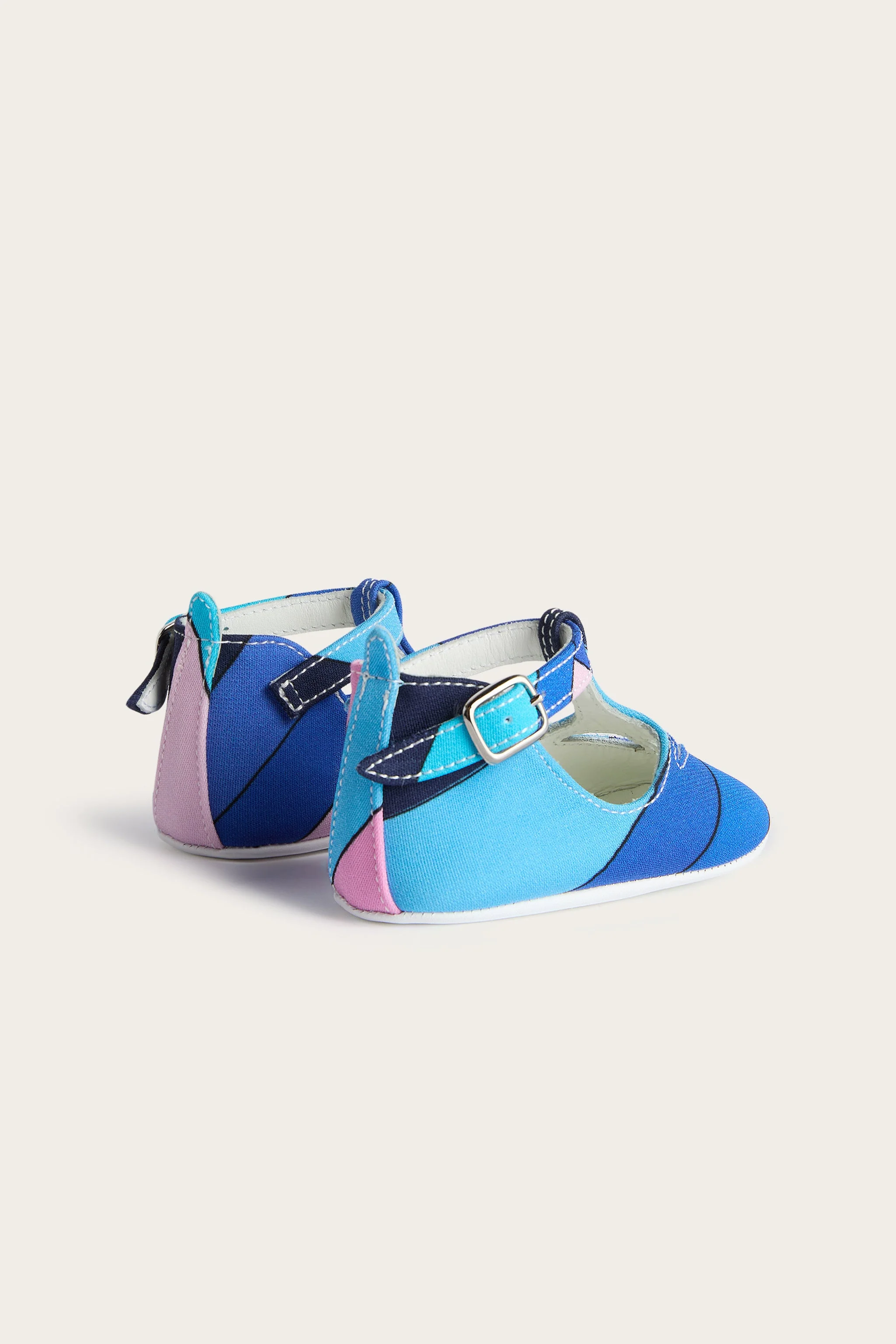 Stile inconfondibile fin dai primi passi…Queste scarpette modello ballerina sono pensate per donare comfort e dolcezza ai piedi più piccoli, con un design tenero e raffinato. Il tessuto in cady stretch avvolge delicatamente, mentre la stampa Iride in azzurro e multicolor aggiunge una nota vivace e colorata, tipica del mondo Pucci.I dettagli in pelle rendono il modello ancora più prezioso, perfetto per le occasioni speciali o come regalo indimenticabile.