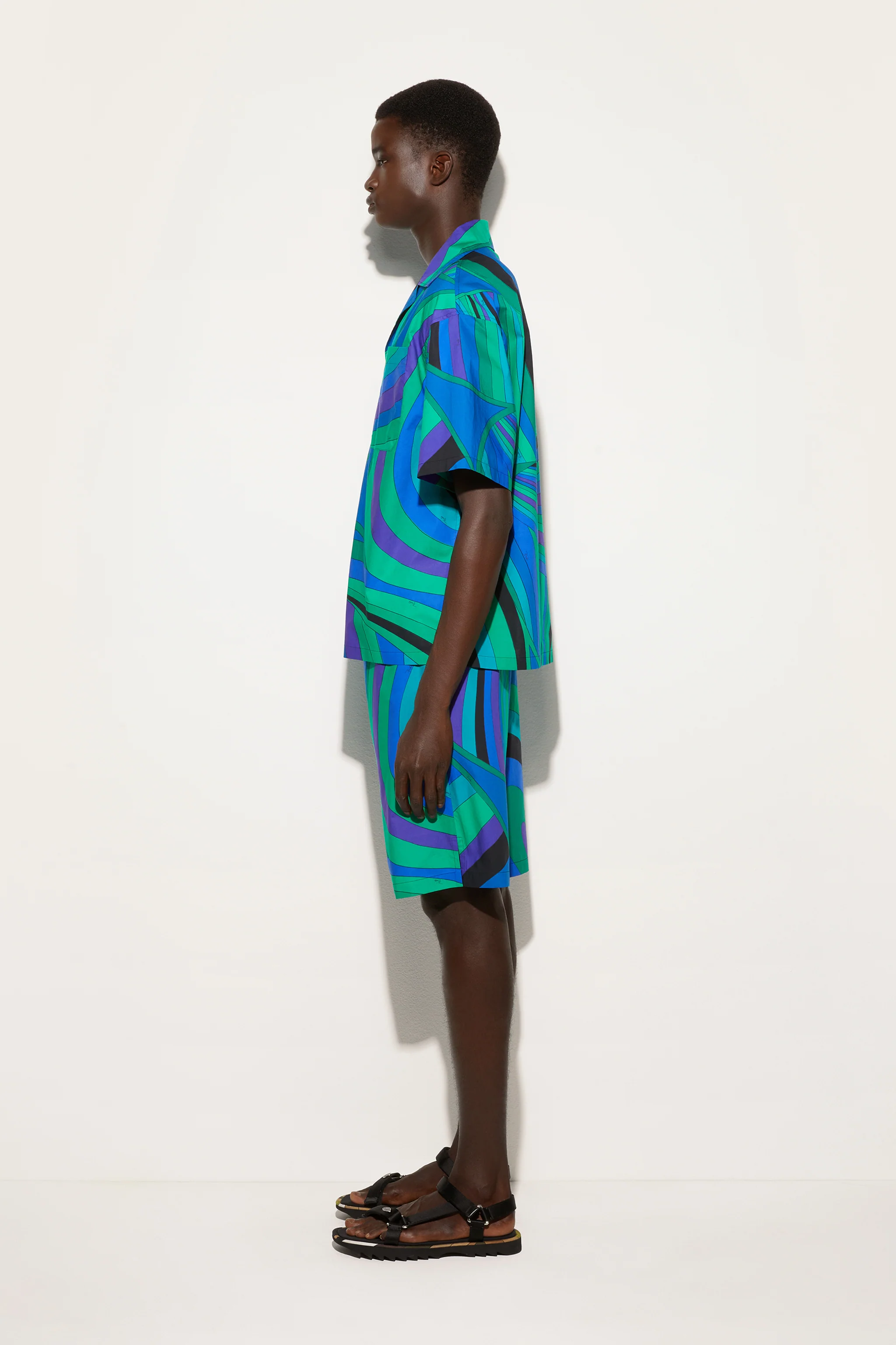 Un classico del guardaroba reinterpretato con l'inconfondibile tocco Pucci. Questa camicia da bowling dal taglio ampio unisce comfort e stile, grazie alla sua linea dritta e rilassata. Il taschino sul petto aggiunge un dettaglio sartoriale, mentre il popeline di cotone leggero garantisce freschezza e una morbida finitura al tatto. La stampa Iride in smeraldo dona un’energia vibrante al capo, rendendolo perfetto per chi ama vestire con carattere e leggerezza.