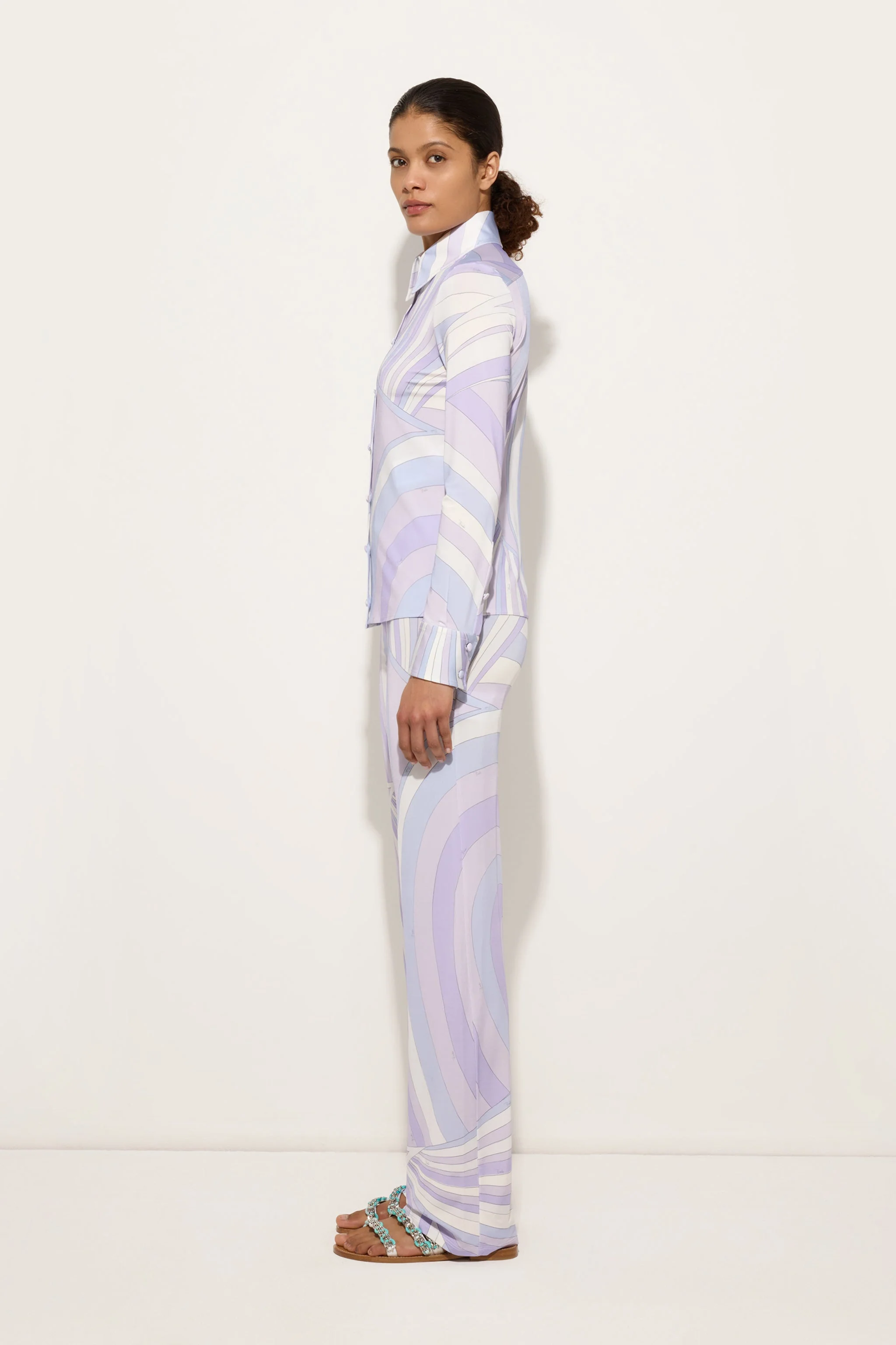Una camicia sofisticata dalla linea affusolata, che unisce eleganza sartoriale e comfort contemporaneo. Realizzata in jersey satin con filati di Lycra ritorta, si distingue per la sua superficie luminosa e fluida. Il taglio aderente valorizza la figura, mentre colletto classico e chiusura con bottoni richiamano lo stile delle camicie tradizionali. La stampa Iride lavanda, iconico motivo degli archivi Pucci, dona una nota cromatica distintiva e vivace al capo.