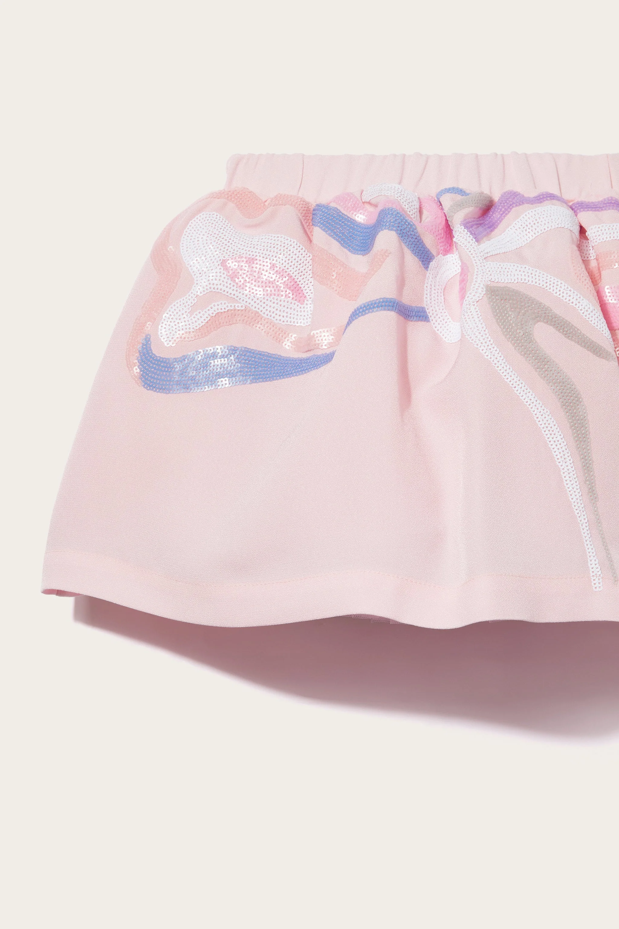 Sequenze di paillettes pastello sembrano danzare sullo sfondo rosa di questa gonna, disponendosi a formare un motivo che ricorda le curve della stampa Marmo. Il capo è completato da una fascia elasticizzata in vita per una nota funzionale.