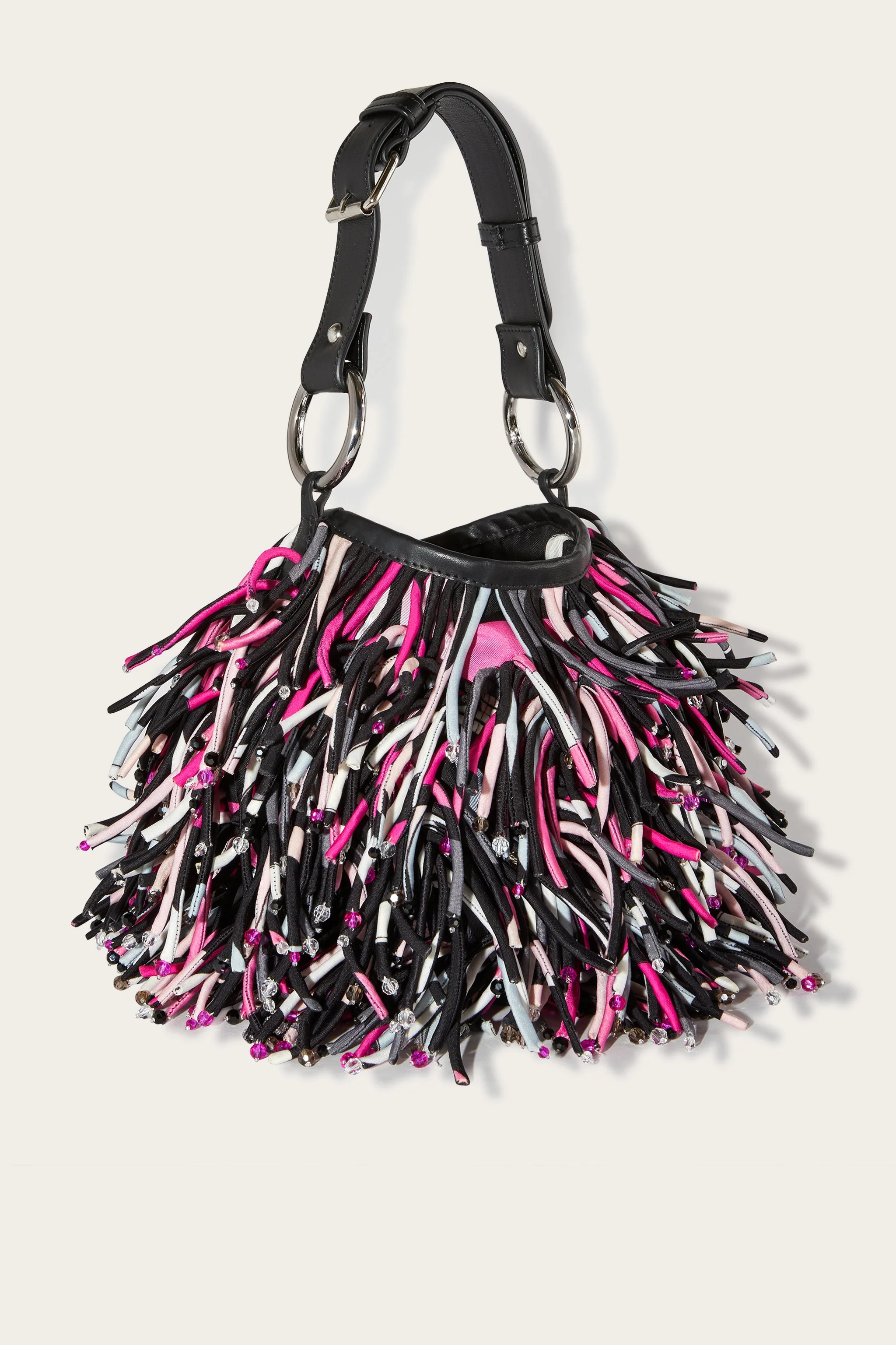 Un accessorio audace e sofisticato, perfetto per chi ama farsi notare. Questo secchiello con frange, impreziosito dalla stampa Marmo in nero/fucsia, è un capolavoro di artigianalità e design. Il manico regolabile con fibbia garantisce comfort e versatilità, mentre i dettagli ricercati, come il tirazip a forma di pesce e le perline decorative, aggiungono un tocco distintivo. Che sia abbinata a look da sera o ad un outfit più casual, questa borsa è una vera dichiarazione di stile.
