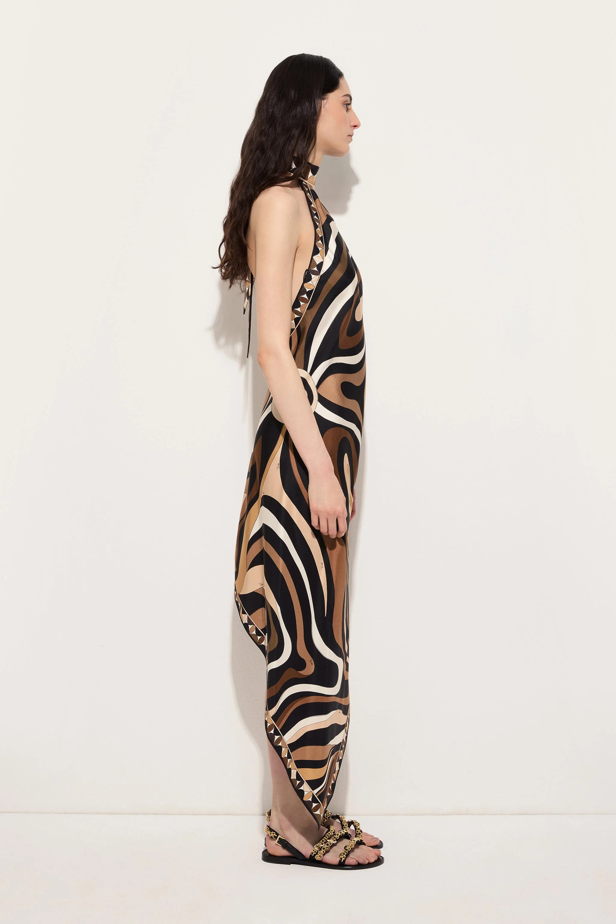 Con un’eleganza sinuosa e una costruzione sofisticata, questo abito lungo in twill di seta incarna l’estetica fluida di Pucci. Il design presenta uno scollo all’americana che si allaccia dietro al collo, mettendo in risalto le spalle. L’orlo a forma di rombo crea movimento e dona slancio alla silhouette. La stampa Marmo, in nero e oro, aggiunge un tocco grafico d’archivio dal forte impatto visivo.