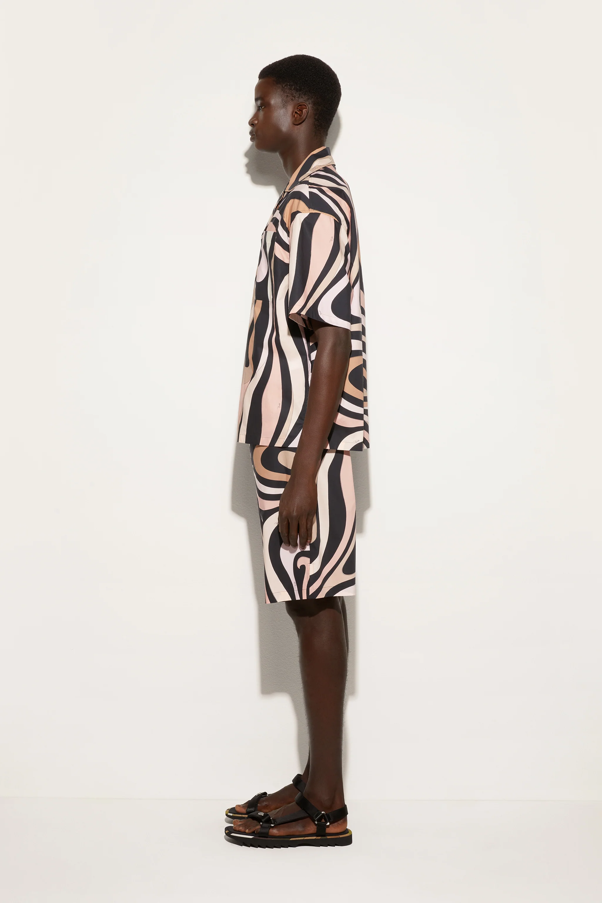 Linee essenziali e un fit rilassato definiscono questi pantaloncini larghi e squadrati, pensati per offrire comfort e stile. Il design strutturato, con una lunghezza che arriva appena sotto le ginocchia, conferisce un look moderno e versatile.Realizzati in 100% cotone, garantiscono leggerezza e traspirabilità, perfetti per il tempo libero. La stampa Marmo in nero e nude aggiunge un tocco distintivo, esaltando il carattere grafico e dinamico tipico dell’estetica Pucci.