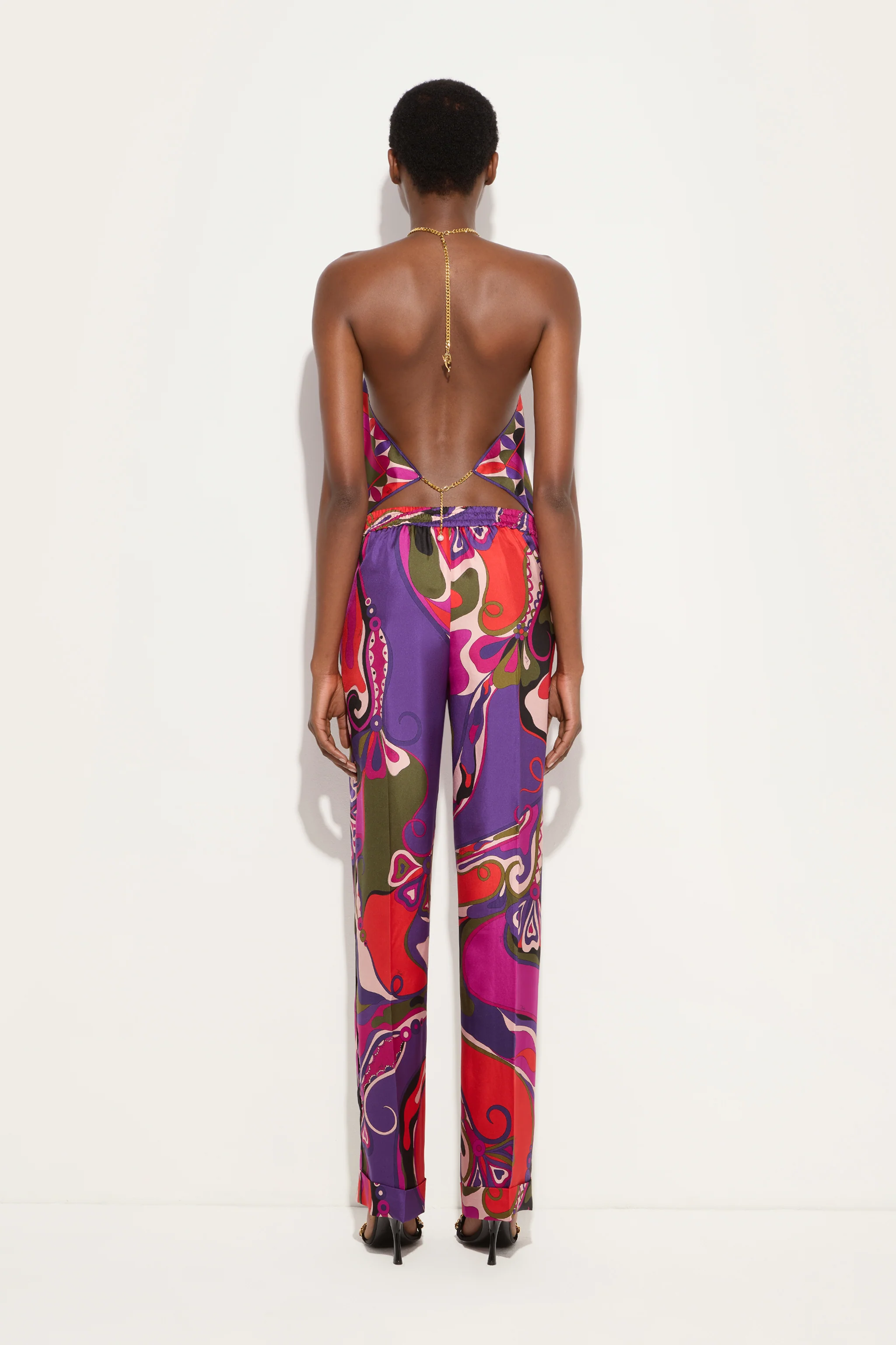 Linee scivolate e dettagli preziosi definiscono lâeleganza di questo top fluido in pura seta. Il design Ăš caratterizzato da uno scollo allâamericana, che lascia le spalle scoperte e valorizza il dĂ©colletĂ© con un tocco raffinato. A completare il look, una catena dorata applicata al collo dona luce e un accento gioiello. La stampa Orchidee in lavanda, ispirata allâestetica orientale e alla natura reinterpretata da Pucci, avvolge la seta con un movimento armonioso.
