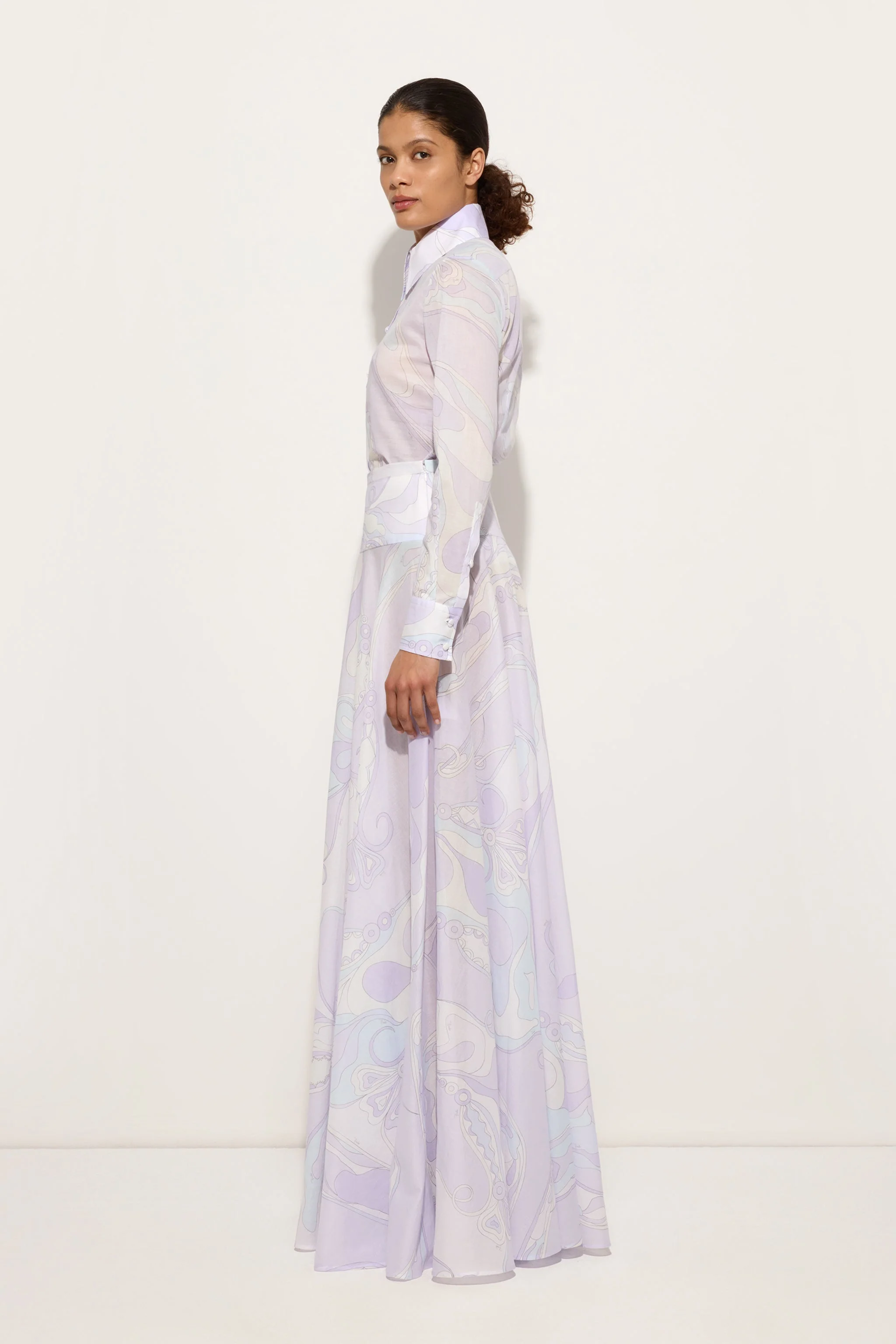Una silhouette essenziale che lascia spazio all’espressività delle stampe Pucci: questa camicia a maniche lunghe è un omaggio alla grazia naturale dell’iconica stampa Orchidee. Reinterpretata in delicati toni lavanda, la fantasia — nata nel 1966 — richiama l’estetica orientale e le linee sinuose della natura, evocando la corteccia degli alberi e l’eleganza dei fiori stilizzati. Realizzata in mussola di cotone leggero, il tessuto regala una mano piacevolmente morbida e una vestibilità che avvolge con naturalezza. Il taglio slim valorizza la figura, mentre le spalle regolari e il colletto classico ne fanno un capo versatile da indossare con disinvoltura, in contesti sia quotidiani che raffinati.