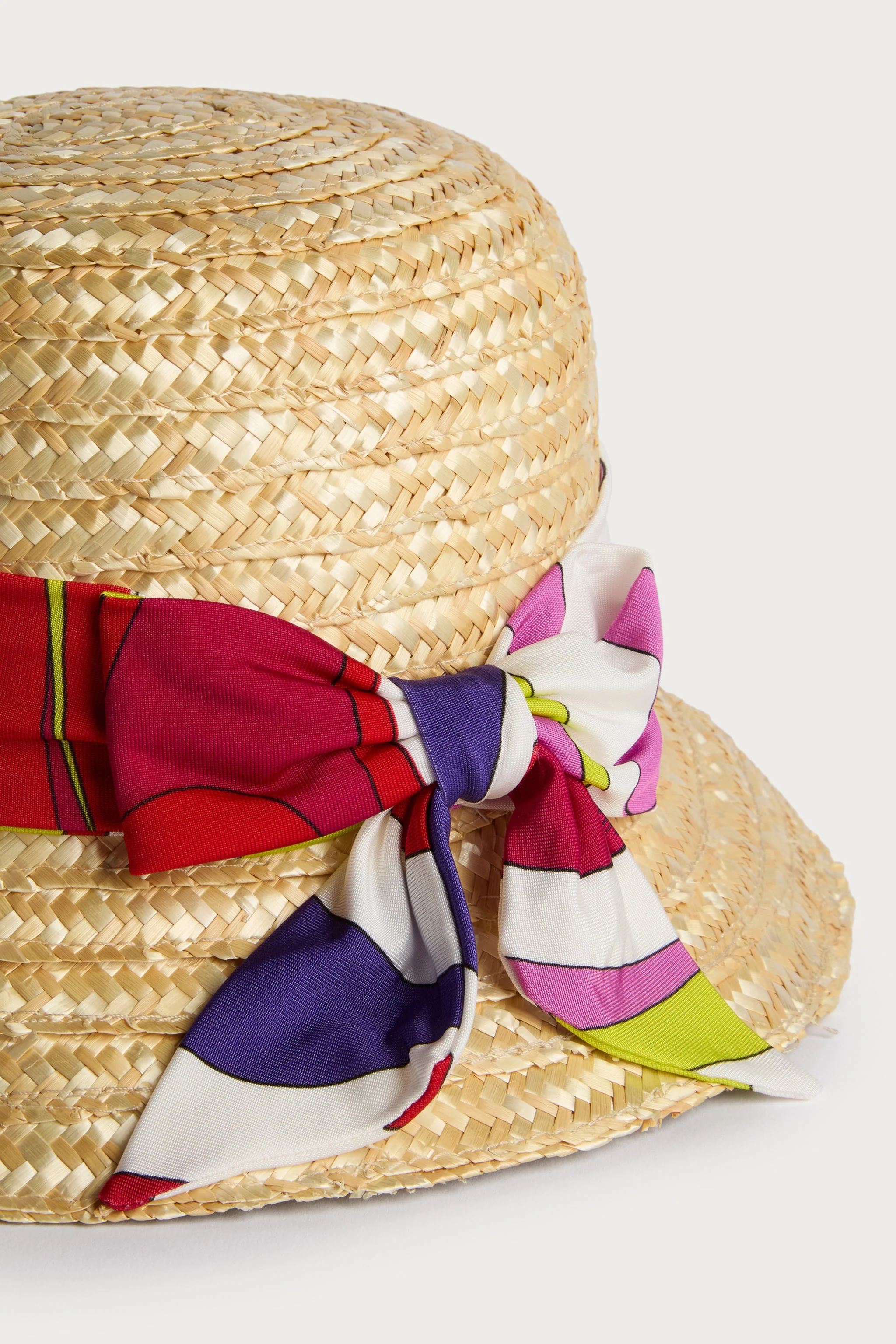 Perfetto per le giornate di sole, questo cappello in paglia unisce protezione e stile con un tocco di giocosa eleganza. La struttura leggera e traspirante è arricchita da un fiocco decorativo in tessuto elasticizzato, impreziosito dalla fantasia Pucci dai colori vivaci.Un accessorio ideale per completare con charme i look estivi delle più piccole, proteggendole dal sole con tutta la fantasia dell’universo Pucci.
